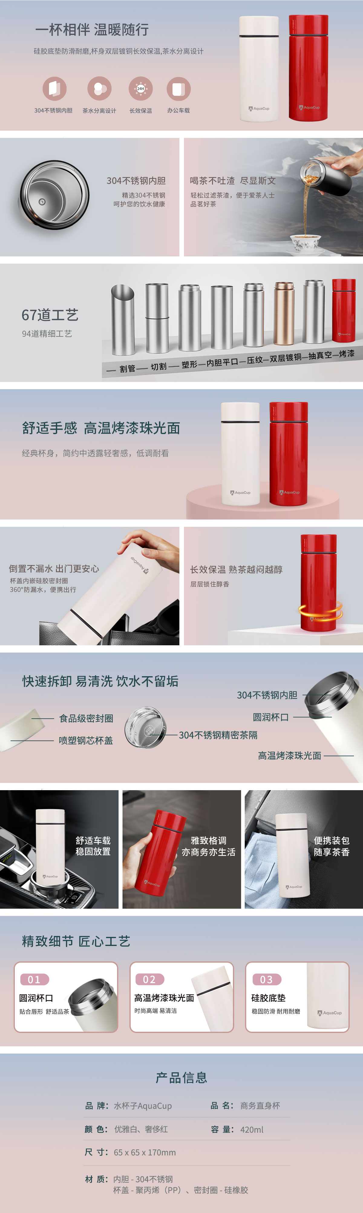 商品亮点:304不锈钢内胆,茶水分离设计,67道工艺,长效保温
